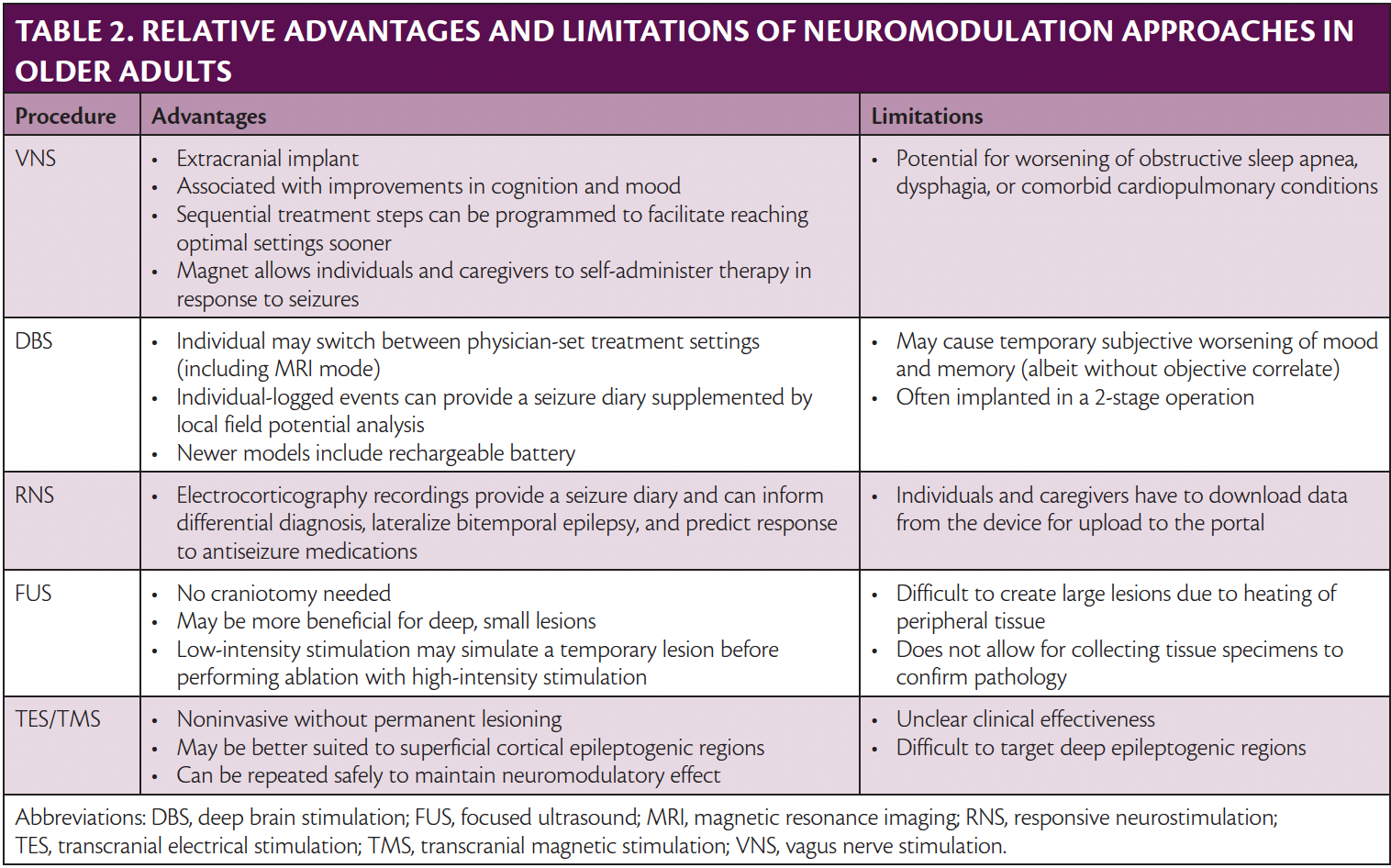 tDCS and rTMS have been posited as potential treatments for epilepsy but have not yet entered the standard clinical armamentarium. Recent systematic reviews of tDCS and TMS interventions suggested improvements in seizure frequency (3.2 fewer seizures per month with tDCS, 30% reduction in seizure frequency with rTMS), but there was considerable heterogeneity in stimulation parameters and outcome reporting that limits confidence in these findings.71,72 These interventions included some older adults (age 50 to 75 years), but no specific study has been performed to assess the utility of TES or TMS in the management of older adults with drug-resistant epilepsy. In addition, TES and TMS are unable to induce effective changes in deeper regions, so these approaches may be best suited for targeting superficial cortical epileptogenic regions.73